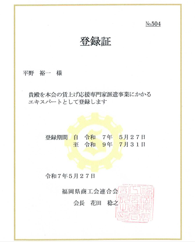 福岡県商工会連合会様の「賃上げ応援専門家派遣事業にかかるエキスパート」として登録されました。